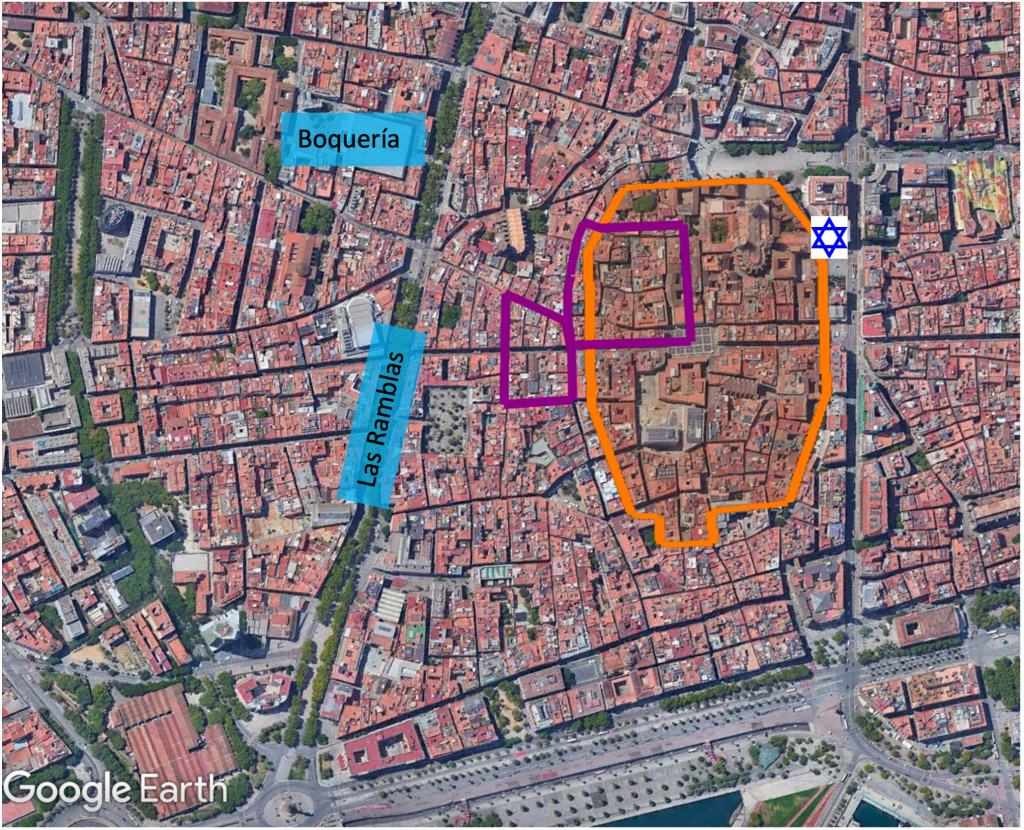 כאשר נמצאים ברובע הגותי של ברצלונה, ממש מאחורי החומות של העיר העתיקה, כפי שמוצג במפה. עד שנת 1391 היה קיים הרובע היהודי בתוך ומחוץ לחומות, מאוד קרוב לקתדרלה.